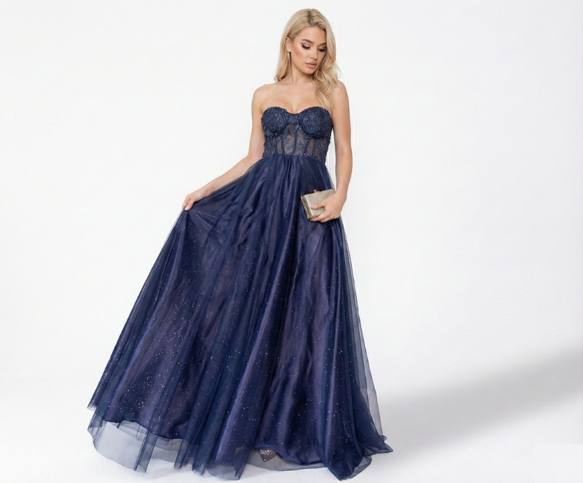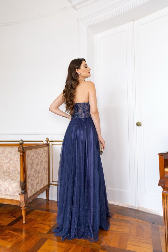 Vestido Azul Marinho com Saia Ampla, Tule de Cristal e Corpete Bordado na Renda com Vidrilhos de Cristal