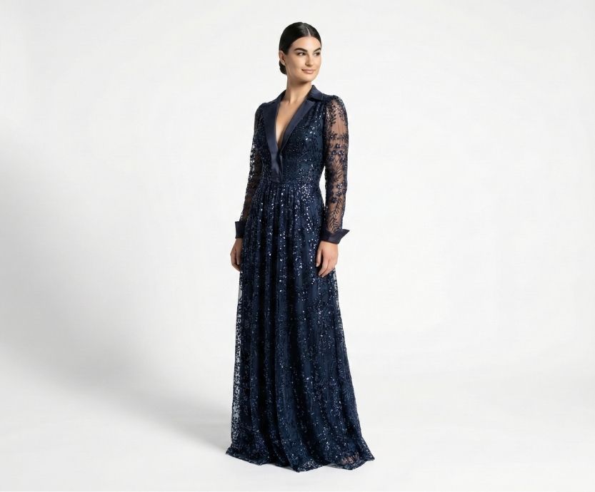Vestido Azul Marinho, Estilo Smoking em Renda Bordada