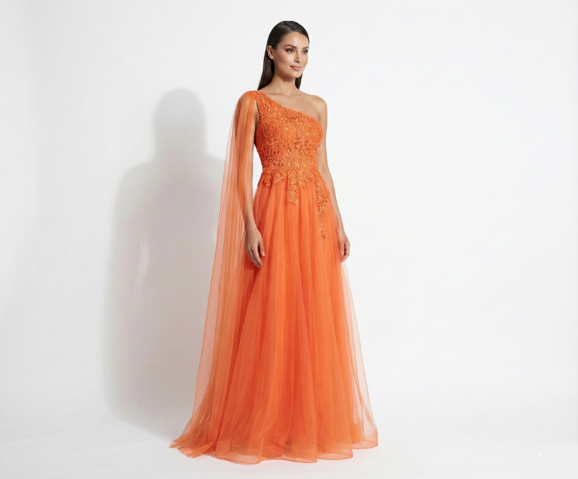 Vestido Coral um Ombro só com Saia de Tule e Corpete em Renda Floral com Manga Lenço
