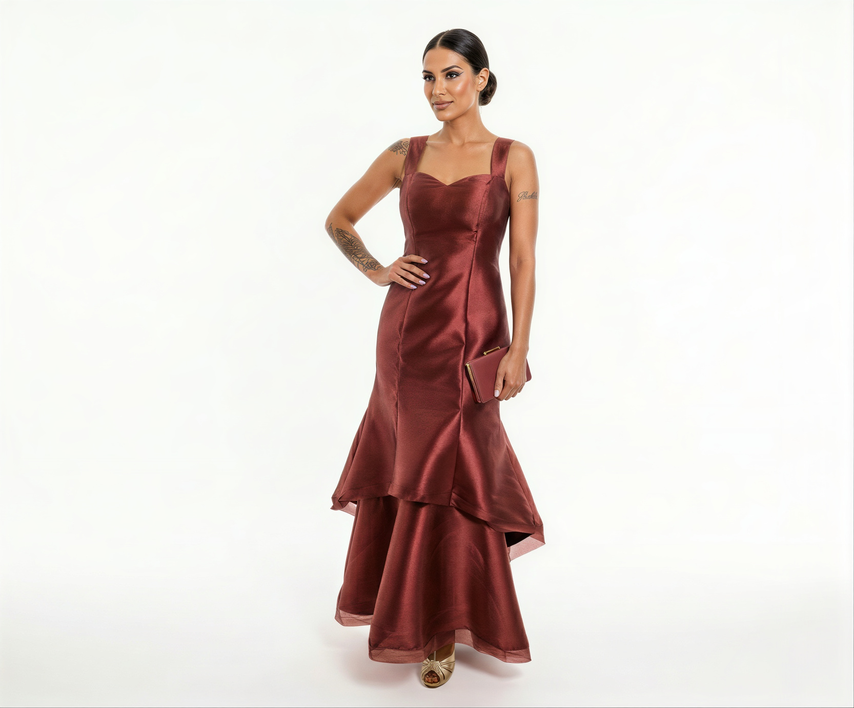 Vestido Longo Marsala em Tafetá com Saia em Camadas