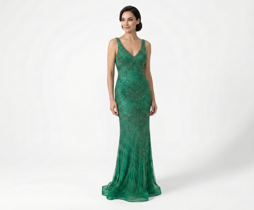 Vestido Longo Verde Bandeira Com Bordados Delicados, Decote em V e Alças
