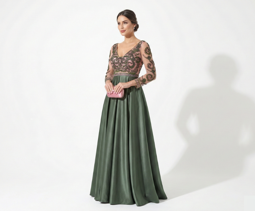 Vestido Longo Verde Oliva em Alfaiataria, com Saia em Pregas e Corpete Bordado no Tule