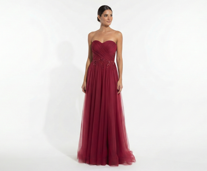 Vestido Marsala Tomara Que Caia com Corpo Plissado, Bordado Delicado na Cintura e Saia em Tule