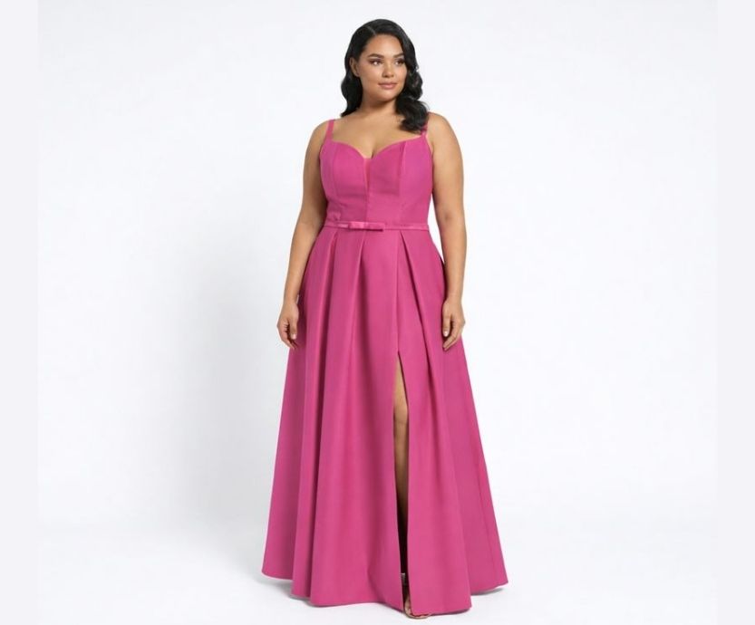 Vestido Rosa Pink com Alças Finas, Corpete Estruturado, Saia Ampla com Pregas e Fenda Frontal