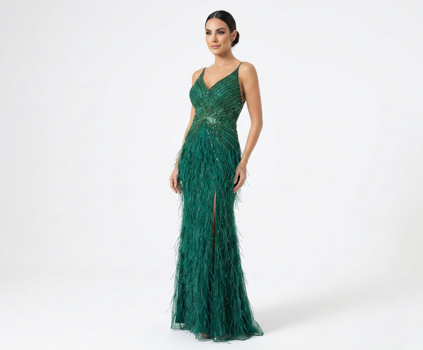 Vestido Verde Bandeira Sereia Bordado com Plumas