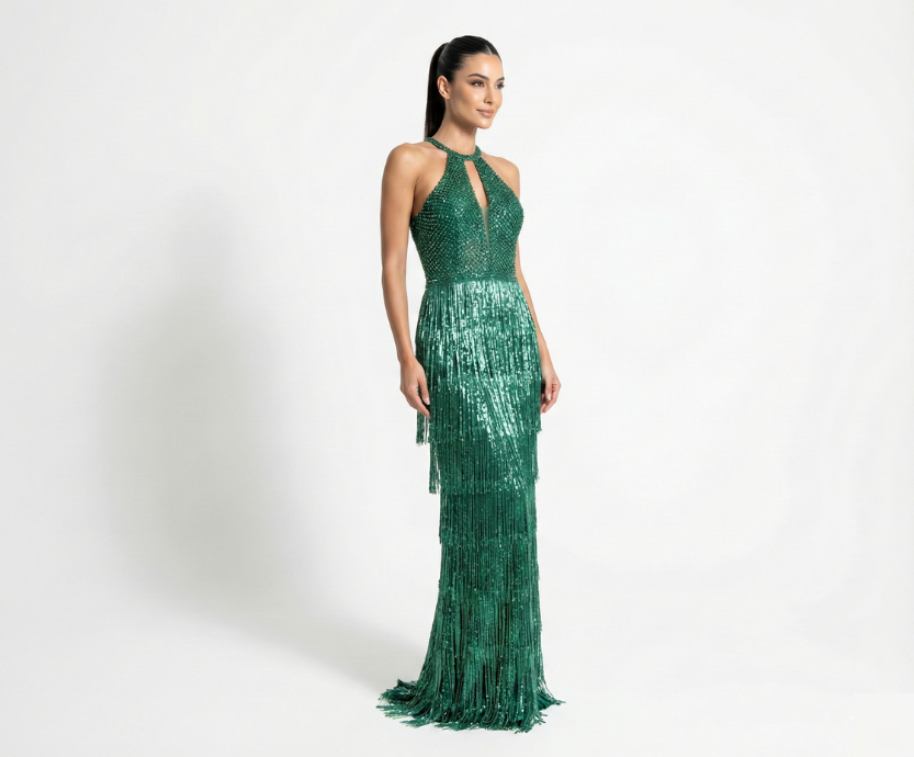 Vestido Verde Esmeralda Todo Bordado Com Franjas