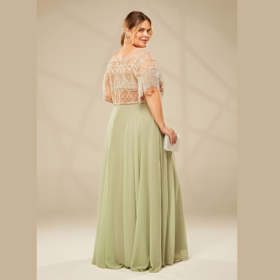 Vestido Verde Menta com Saia em Crepe, Bordado no Corpete, com Franjas na Manga