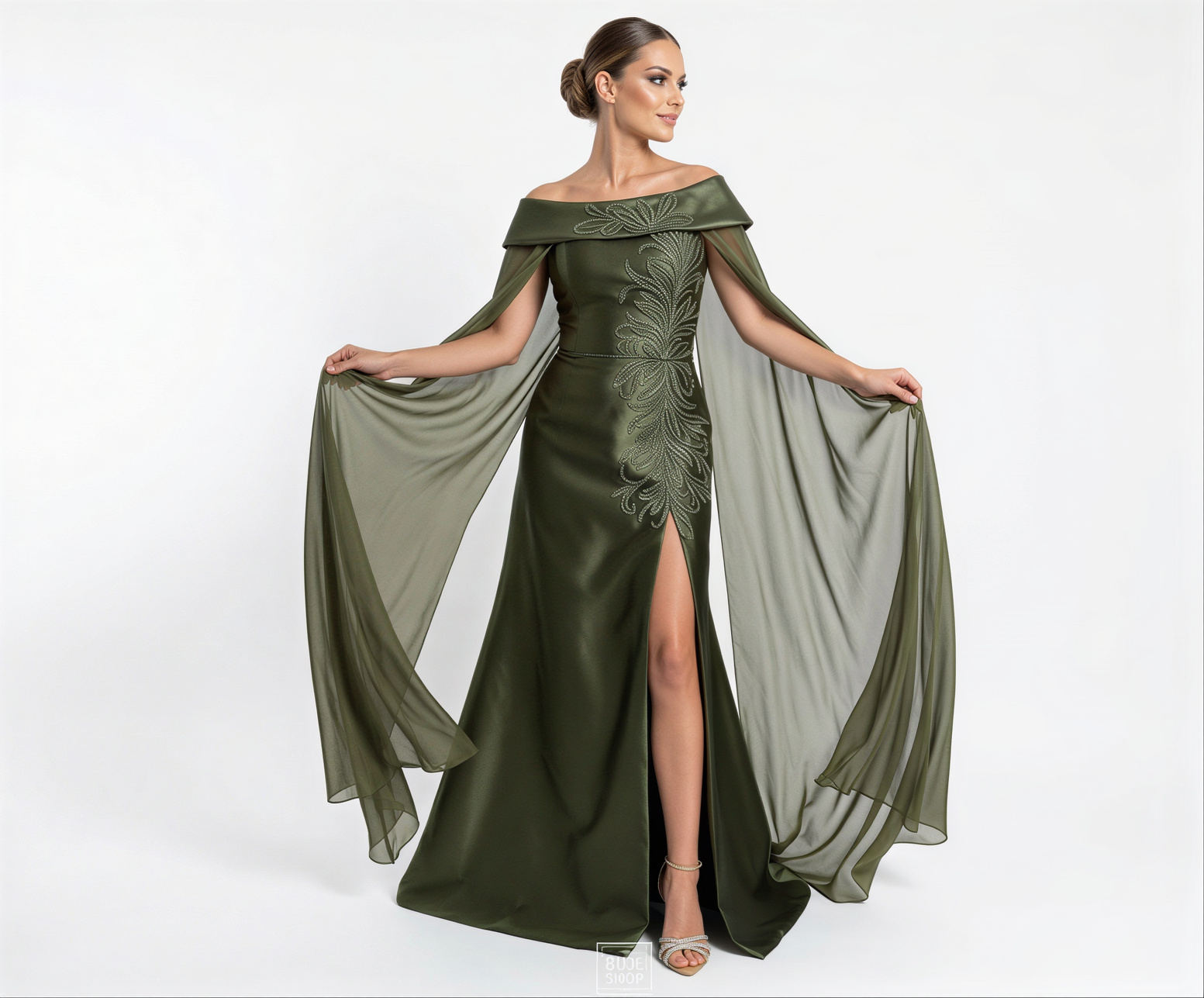 Vestido Verde Oliva Ombro a Ombro Com Bordado e Capa Fluida
