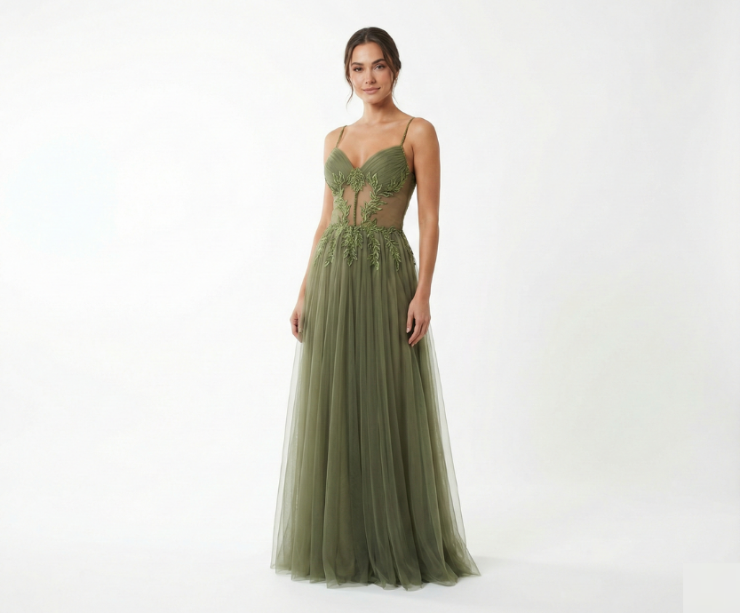 Vestido Verde Oliva Tule Bordado Transparência e Saia Fluida
