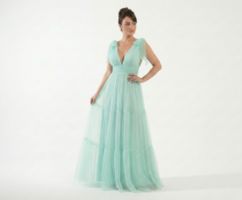 Vestido Verde Tiffany com Decote e Saia em Tule Forrada